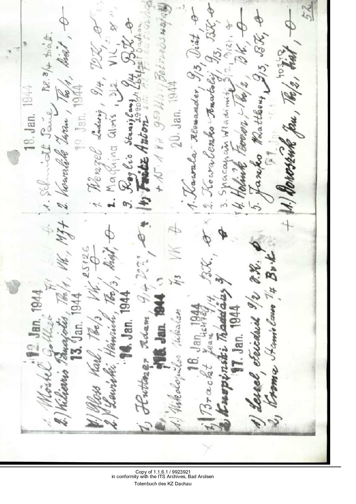 „Auf Grund amtlicher Unterlagen ist der Verstorbene bis zum Jahre 1941 wegen krimineller Vergehen wiederholt bestraft und am 27.11.1942 in polizeiliche Vorbeugungshaft genommen worden. Laut ITS Inhaftierungsbescheinigung vom 1.10.1959 wurde er am 6.1.1943 in das KL Dachau eingewiesen und ist dort am 14.1.1944 verstorben. Als Grund der Inhaftierung ist in den Originalunterlagen das KL Dachau „PSV“ (Polizeiliche Sicherungsverwahrung) angegeben.