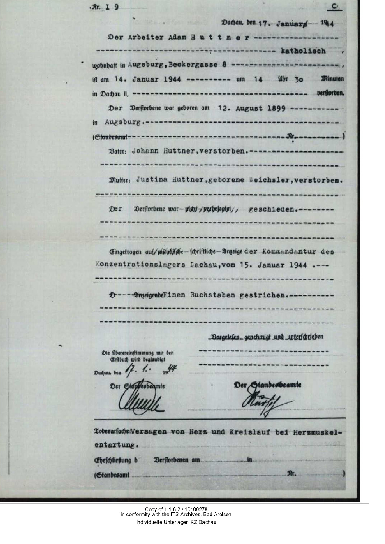 Am 14. Januar 1944 wird Adam Huttner im KZ Dachau ermordet.29 Der Totenschein aus dem KZ Dachau führt als Todesursache „Versagen von Herz- und Kreislauf bei Herzmuskelentartung“ an. Der Kommandeur des KZ setzt als Todesdatum auf den 14. Januar 1944 um 14.30 Uhr.30