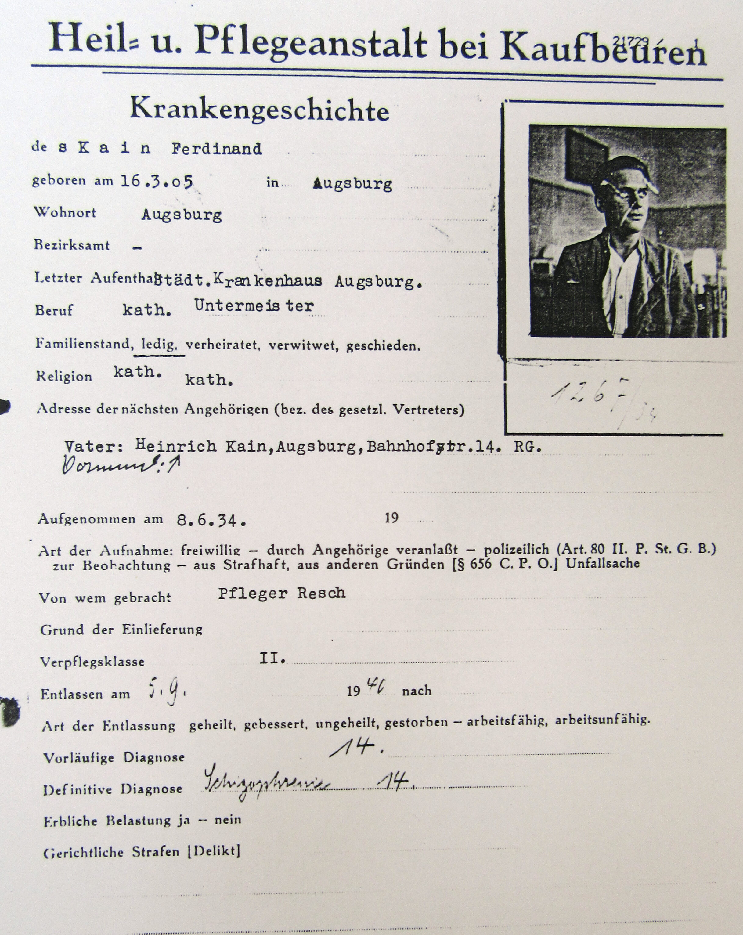 Am Mittwoch, den 6. Juni 1934, wird Ferdinand Kain von der Polizei in die psychiatrische Abteilung des Städtischen Krankenhauses in Augsburg verbracht. Zuhause gab es einen Konflikt mit dem Vater, den er würgt und beißt. Am Freitag wird er vom Krankenhaus Augsburg in die Heilanstalt Kaufbeuren-Irsee überwiesen, Pfleger Resch bringt ihn dorthin. Die Anamnese ergibt Schizophrenie. Ferdinand durchläuft depressive Phasen, er hält sich für ungeliebt, seinen Vater bezeichnet er als Säufer.7 Sein körperlicher Zustand ist ausgezeichnet. Bereits einen Tag später wird mit einer Suffrogelkur begonnen.