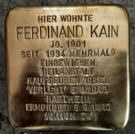 Ferdinand Kain wird am 5. September 1940 mit 75 weiteren Patienten aus Kaufbeuren mit den grauen Bussen der Gekrat26 (Gemeinnützige Krankentransportgesellschaft) in die Tötungsanstalt nach Grafeneck transportiert und dort ermordet. Auf dem Transport vom 5. September befinden sich weitere 30 Personen aus Augsburg und Umgebung.