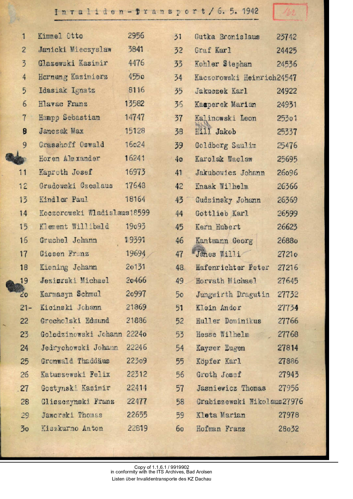Vom 3. bis 7. September 1941 begutachteten Prof. Hermann Nitsche, Prof. Werner Heyde, Dr. Theodor Steinmeyer, Dr. Rudolf Lonauer und andere rund 2.000 Häftlinge im KZ Dachau. Für kranke und invalide Häftlinge gab es in Dachau ein eigenes Invalidenlager.16