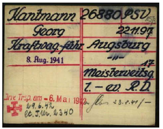 Laut der Meldekarte8 befindet sich Johann ab 29. November 1938 in Untersuchungshaft im Strafgefängnis Landsberg am Lech. Ab dem 9. Februar 1939 sitzt er dort als verurteilter Strafgefangener für 2 Jahre und 3 Monate ein. Im Anschluss an die Haft erteilt die Staatsanwaltschaft Augsburg Georg Kantmann 5 Jahre Ehrverlust, beginnend mit dem Ende der Haft am 27. Mai 1941.9 Wir kennen die Gründe hierfür nicht, jedenfalls ist er nach den rigiden Ordnungsprinzipien des NS-Staates straffällig geworden.