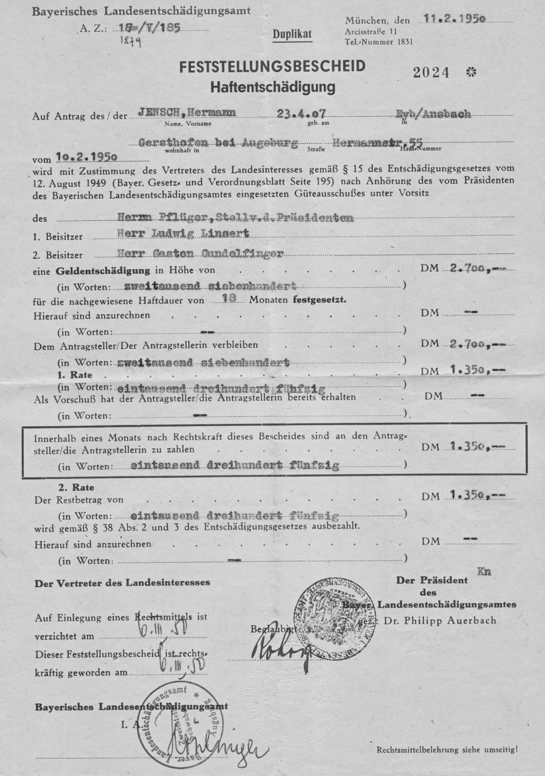 Für seine 18-monatige Haftstrafe erhält Hermann Jensch 1950 eine kleine Entschädigung zugesprochen.