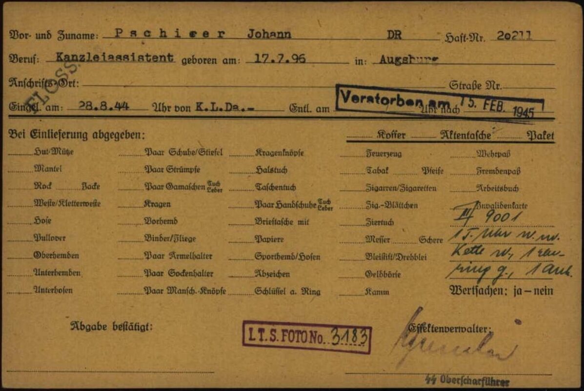 15 Tage später wird Johann Baptist Martin Pschierer ins KZ Flossenbürg (Kreis Neustadt an der Waldnaab) „verschubt“.18 Er hat die Häftlingsnummer 20211.
