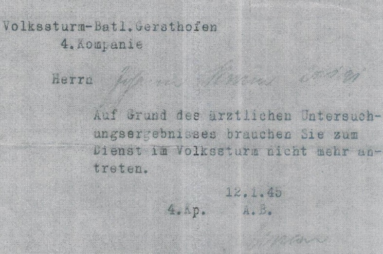 Nach der Katastrophe von Stalingrad56 rekrutieren die Nazis jeden verfügbaren Mann. In diesem Dokument wird er als „arbeitsfähig“ bezeichnet und dem Landsturm II zugeteilt. Infolge eines ärztlichen Attestes kommt es glücklicherweise nicht mehr dazu, dass er Kriegsdienst an der „Heimatfront“ ableisten muss. Das Volkssturm-Bataillon Gersthofen, 4. Kompanie teilt ihm am 12. Januar 1945 mit, dass er infolge der ärztlichen Untersuchung zum Dienst im Volkssturm nicht mehr antreten müsse.57
