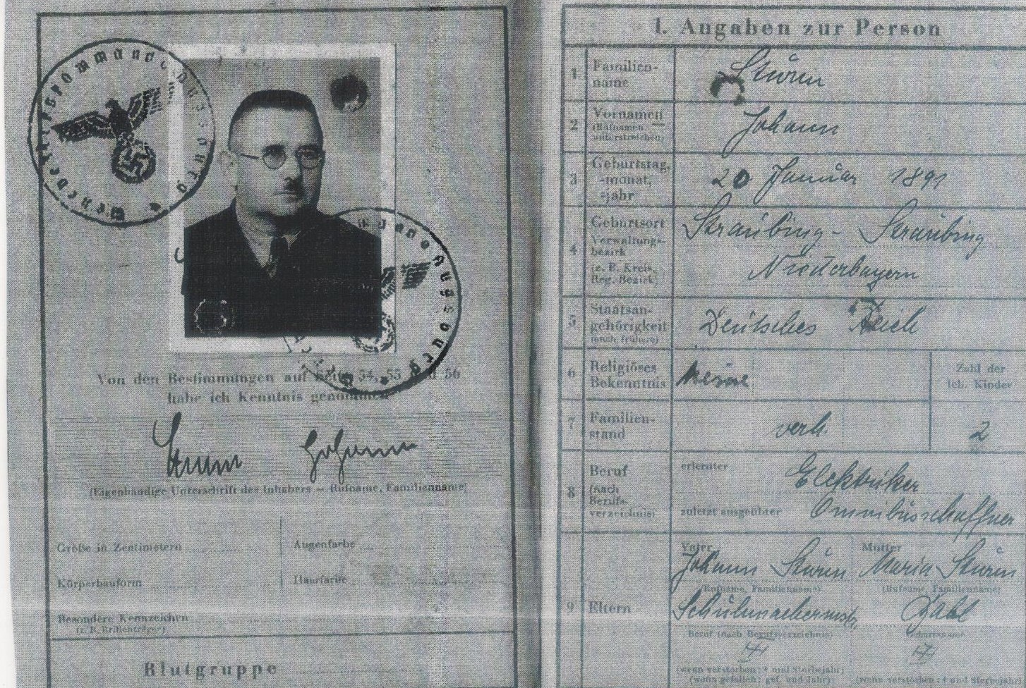 Am 8. Dezember 1943 erhält Johann Sturm einen Wehrpass. Er ist gemustert worden, trotz seiner mittlerweile 52 Jahre!