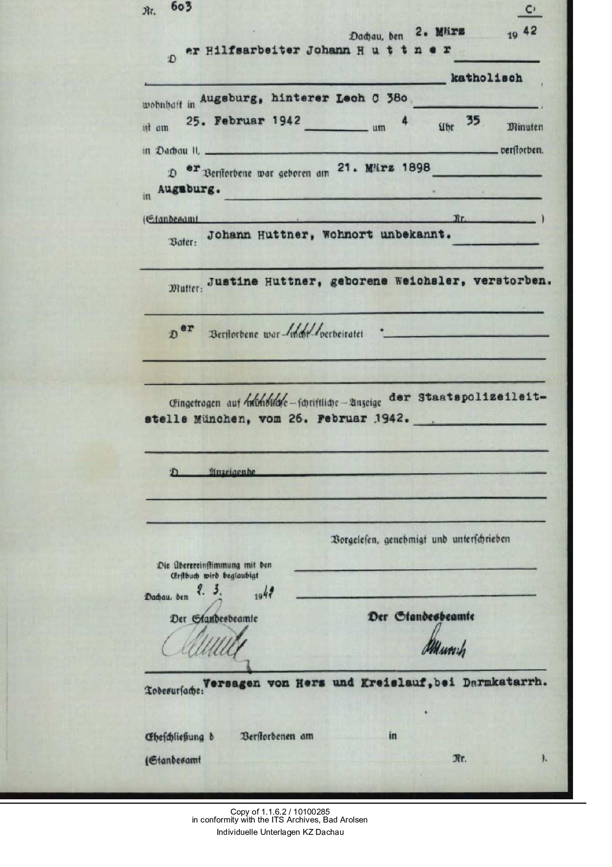 Johann Huttner kommt mit der „ersten Welle“ in die Tötungsanstalt Hartheim. Seine Sterbeurkunde vom 28. Februar 1942 ist fingiert und wurde von Dachau aus erstellt. Dort wurde auch der Todesort Dachau bewusst genannt, um die Massenmorde in Hartheim zu vertuschen. Als Todesursache wurde „Versagen von Herz und Kreislauf bei Darmkatarrh“ angeführt.23
