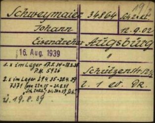 Aber er ist kaum 2 Monate wieder in Augsburg, da gerät er ab 12. April 1935 erneut als Polizeihäftling (PH) in „Schutzhaft". Johann verbringt genau 3 Jahre ununterbrochen im KZ Dachau. Vom 30.11.36 bis 24.12.36 ist er im Krankenhaus Schwabing, den medizinischen Grund hierfür kennen wir allerdings nicht.18 Am 20.4.39, nach einer Amnestie anlässlich des „Führergeburtstages“ darf Johann wieder nach Augsburg zurück.19