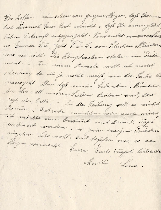 Wir hoffen & wünschen von ganzem Herzen, daß Ihr nun doch diesmal Euer Ziel erreicht, daß Ihr einer glücklichen Zukunft entgegengeht. Verwendet unsere Sachen in Euerm Sinn, gebt Frau J. von Schuhen und Kleidern was sie will. Die Hauptsachen stehen im Testament. – An mein Annele will ich nicht schreiben, da ich ja nicht weiß, wie die Sache hinausgeht. Aber daß meine Gedanken & Wünsche bei ihr & all unsern Lieben drüben sind, das sagt ihr bitte. – In die Zeitung soll es nicht kommen & Grabrede möchten wir auch nicht; ich möchte nur bestimmt mit dem l[ieben] Papa verbrannt werden & so zum ewigen Frieden eingehn. Lebt wohl, seid tapfer wie es von Herzen wünscht