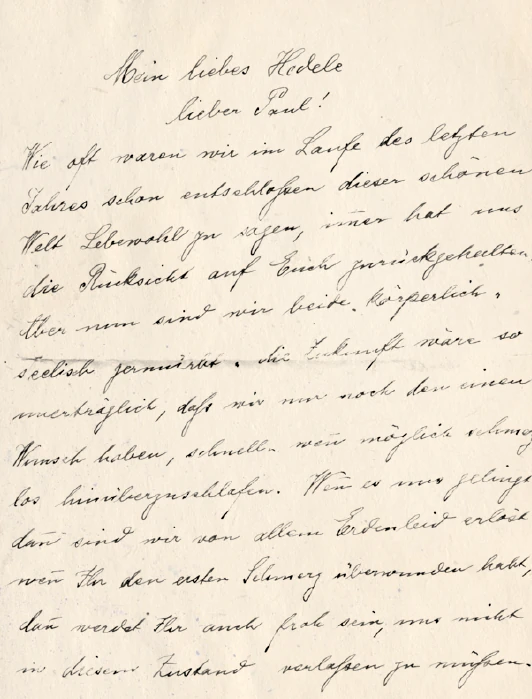lieber Paul!Wie oft waren wir im Laufe des letzten Jahres schon entschlossen[,] dieser schönen Welt Lebewohl zu sagen, immer hat uns die Rücksicht auf Euch zurückgehalten. Aber nun sind wir beide körperlich & seelisch zermürbt & die Zukunft wäre so unerträglich, daß wir nur noch den einen Wunsch haben, schnell & wenn möglich schmerzlos hinüberzuschlafen. Wenn es uns gelingt[,] dann sind wir von allem Erdenleid erlöst und wenn Ihr den ersten Schmerz überwunden habt, dann werdet Ihr auch froh sein, uns nicht in diesem Zustand verlassen zu müssen.