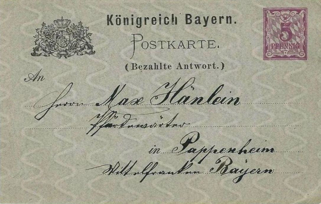 Um 1900 gab es nur noch 22 jüdische Bürger in Pappenheim, da ab Mitte des 19. Jahrhunderts viele Juden aus ländlichen Regionen in größere Städte gezogen waren.1 Unter diesen 22 waren auch Max Haenlein und seine Frau Thekla, geb. Pfeiffer. Sie waren die Eltern von Leopold Abraham Haenlein, genannt „Leo“. Max Haenlein wurde am 19. April 1864 in Pappenheim geboren und war von Beruf Pferdewärter, Kaufmann und Reisender, genauso wie sein Sohn später auch.2