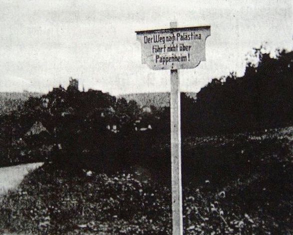Die Judenfeindlichkeit in Pappenheim lässt sich an einem Foto eines Schildes am Ortseingang festmachen, auf dem geschrieben stand: „Der Weg nach Palästina führt nicht über Pappenheim!“6