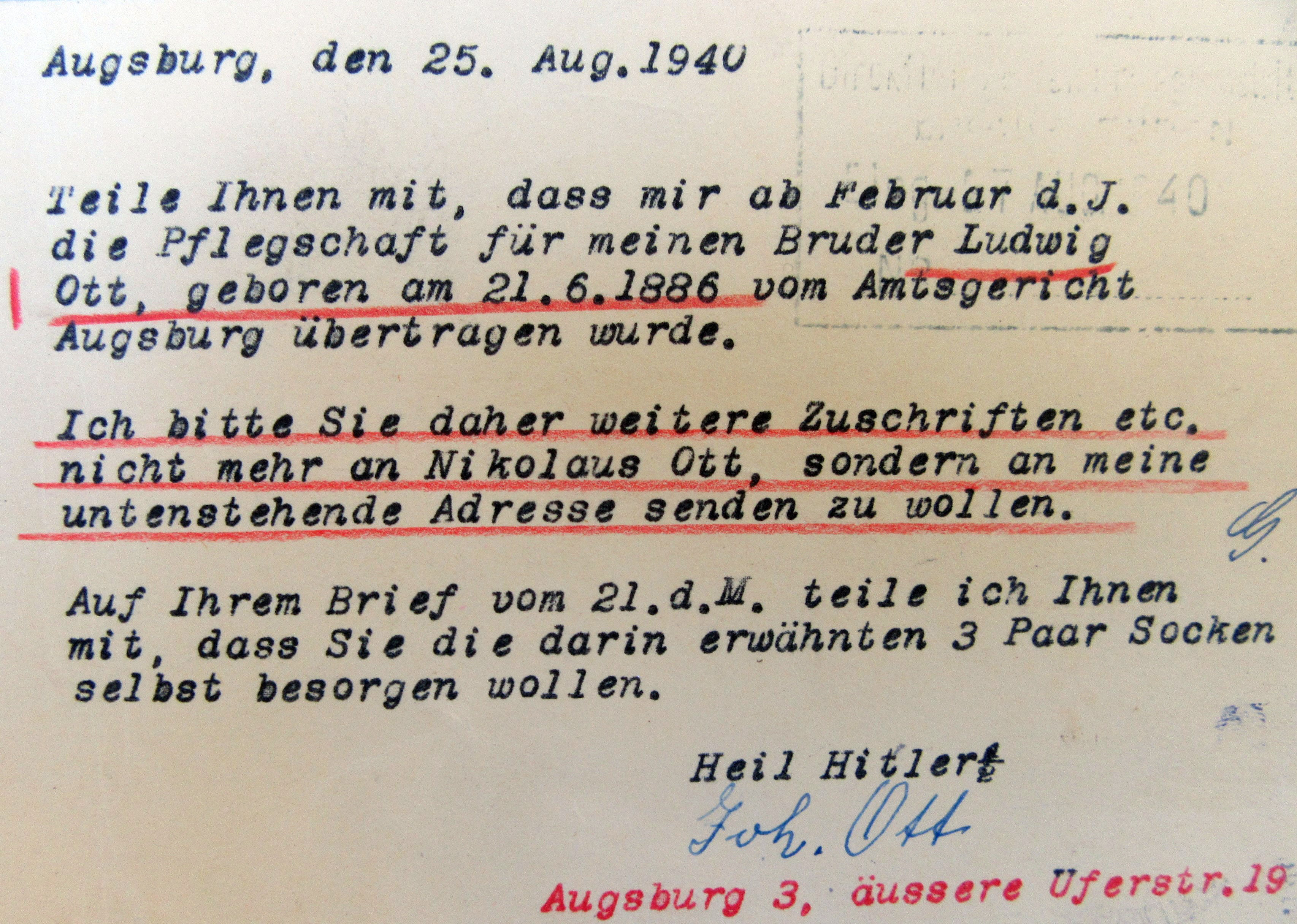 Sein Bruder und Vormund Johann erhält am 17. März 1945 das Telegramm: „Ludwig Ott verstorben. Die Leiche wird feuerbestattet, wenn nicht Einspruch erhoben wird. Feuerbestattung am 27.3.45“.