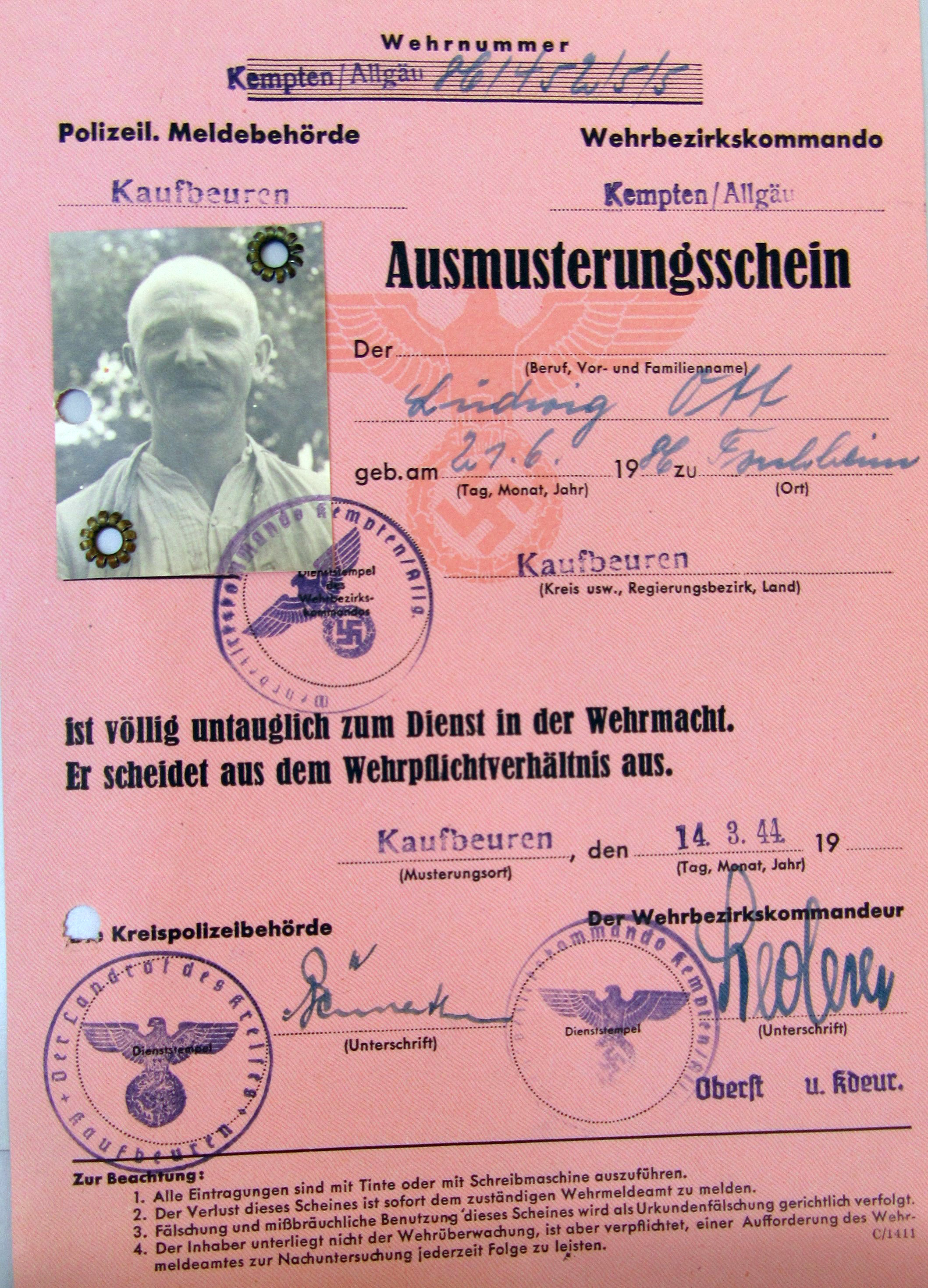 Nach zweijähriger Dienstzeit wird Ludwig Ott im November 1910 aus dem Militärdienst entlassen und erhält eine Rente von 45 RM monatlich.11 Einer Arbeit kann Ludwig in Augsburg nicht nachkommen, er wird von seiner Mutter betreut.