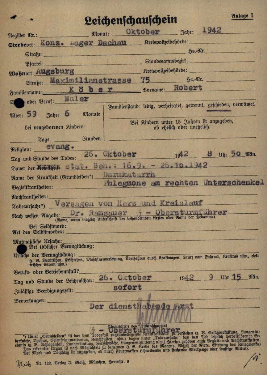 Der Lagerarzt, ein SS-Obersturmführer Dr. Ramsauer, attestiert „Versagen von Herz- und Kreislauf bei Darmkatarrh“ als Todesursache.27 Zum Zeitpunkt seines Todes ist Robert Köber 59 ½ Jahre alt.