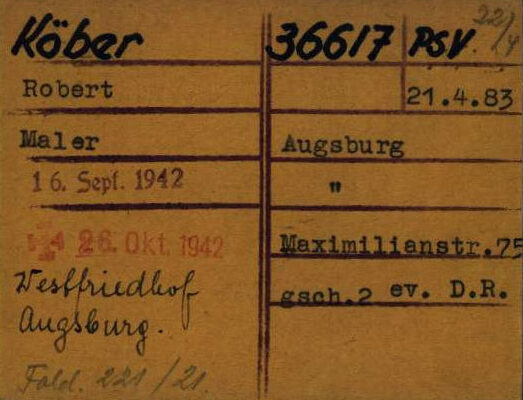Am 16. September 1942 kommt Robert Köber mit der Gefangenennr. 36617 ins KZ Dachau.25 Bereits im Oktober 1941 hatte die Kriminalpolizeistelle Augsburg von der Kriminalbiologischen Sammelstelle in München ein kriminalbiologisches Gutachten über den Maler Robert Köber angefordert, „zum Zweck der vorbeugenden Verbrechensbekämpfung“, was nur die Sicherungsverwahrung im KZ bedeuten konnte.26 Bis zu diesem Zeitpunkt hatte Robert Köber 22 Haftstrafen hinter sich.