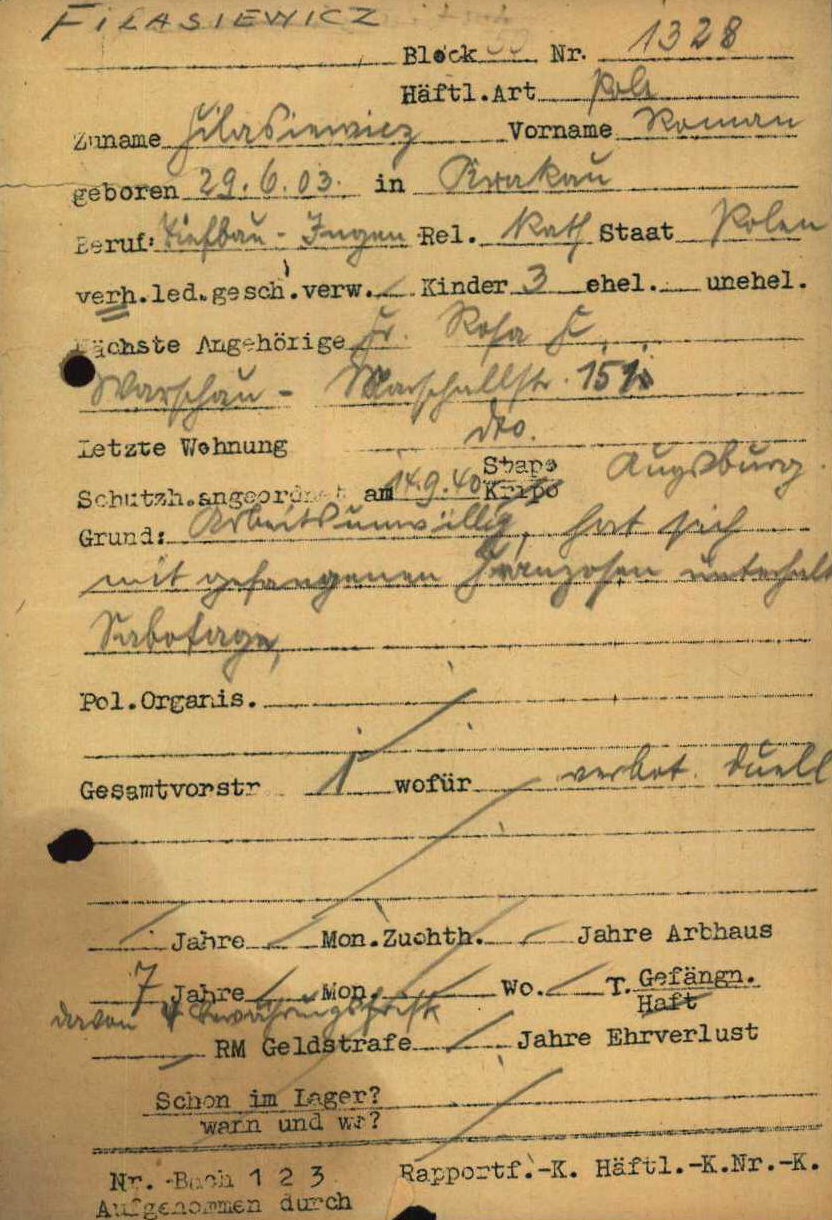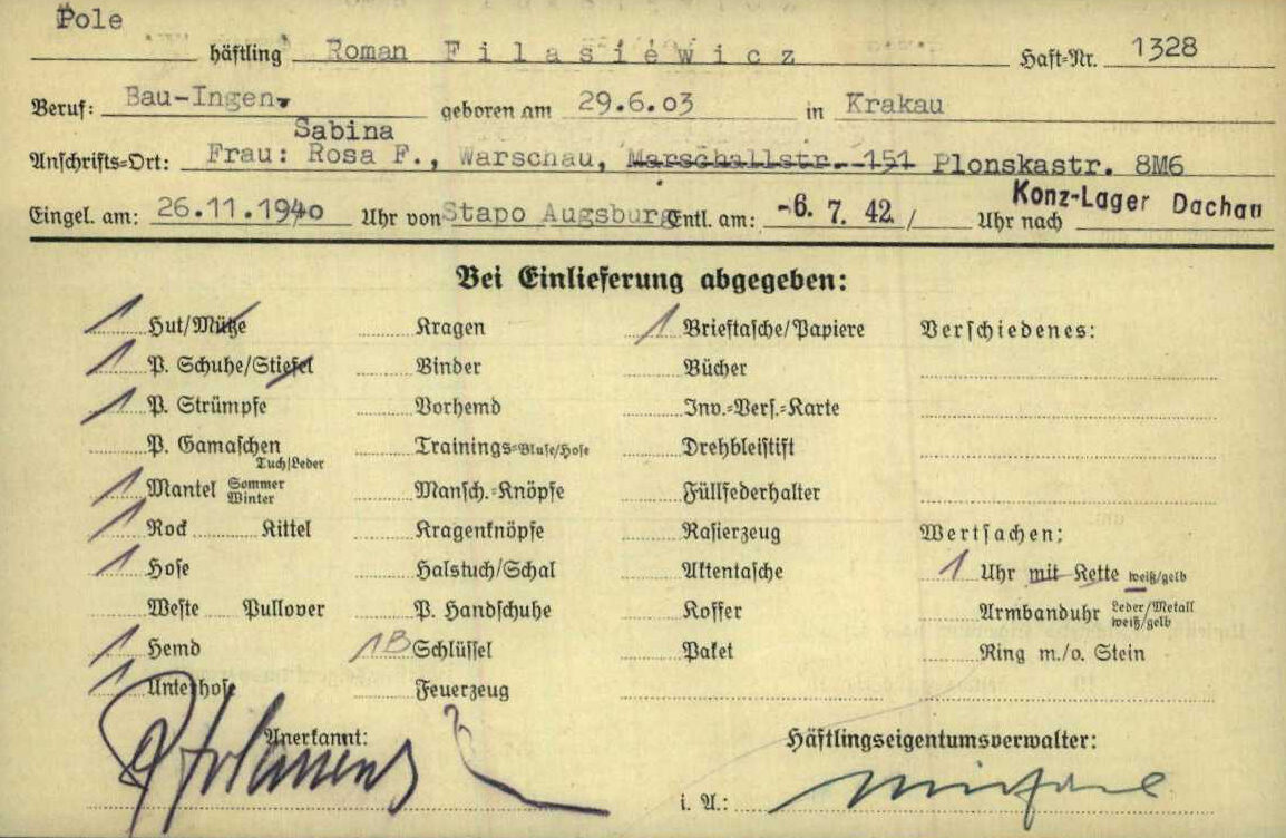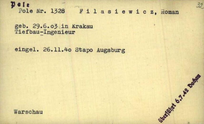 Am 7. Juli 1942 wird Roman Filasiewicz von Buchenwald ins KL Dachau überstellt und als Häftling 30937 registriert.13