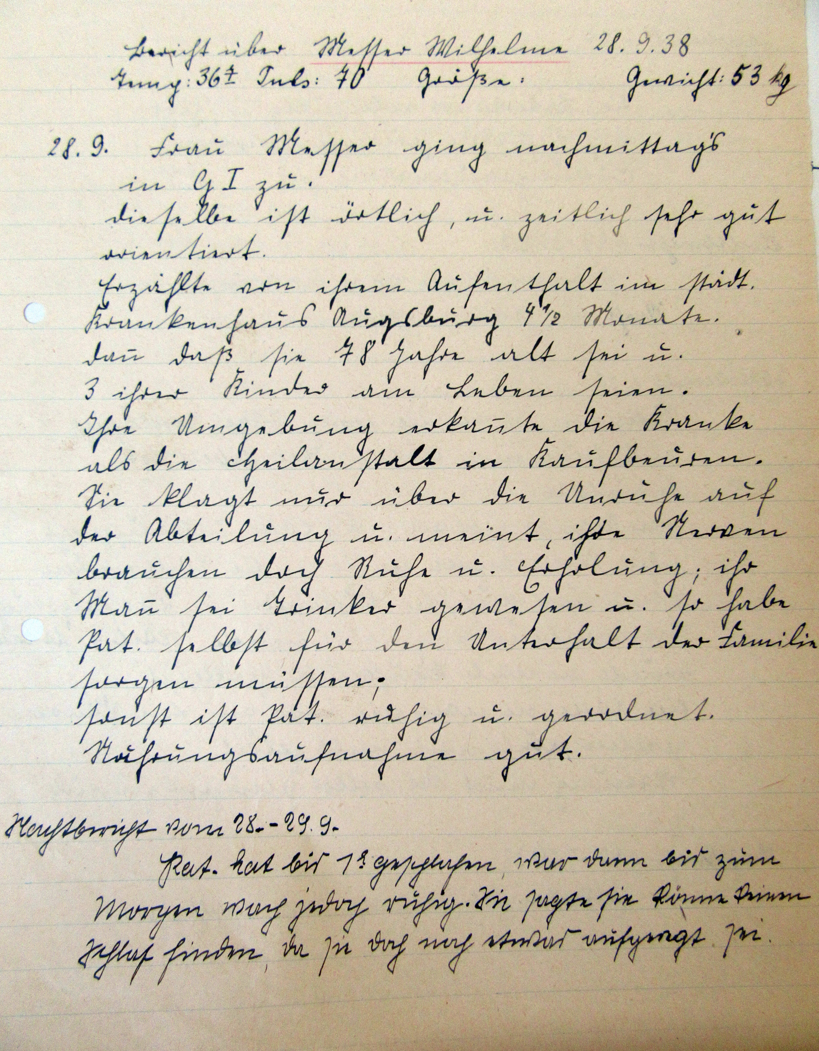 Trotz ihrer 78 Jahre macht sie bei der Anamnese einen geistig und körperlich frischen, aufgeräumten Eindruck und ist örtlich und zeitlich bestens orientiert. Sie erzählt über ihren 4 ½ monatigen Aufenthalt im Augsburger Krankenhaus und über ihre 3 Kinder und ihren verstorbenen Ehemann. Die Patientin sei freundlich und fleißig und versorge sich selbst.15