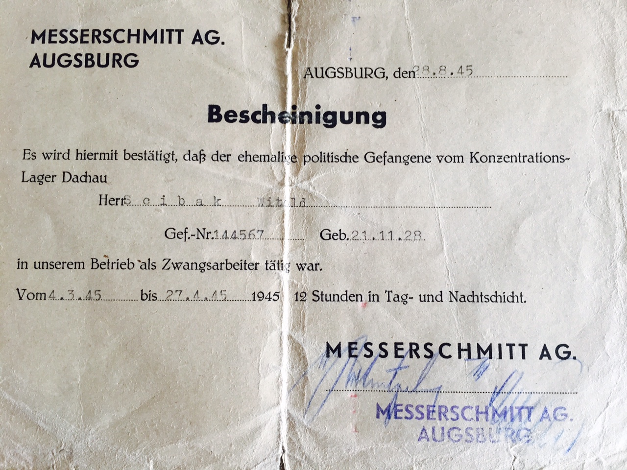 Ab Anfang März 1945 muss der 15-jährige nach Augsburg und leistet direkt Zwangsarbeit bei der Firma Messerschmitt. 12 Stunden am Tag, in Tages- und Nachtschichten. Zur Arbeit nach Haunstetten marschieren die Zwangsarbeiter durch Pfersee zum Lokalbahngleis in der Nähe der Hans-Adlhoch-Schule. Von dort werden sie mit der Lokalbahn zum Werk in Haunstetten transportiert.